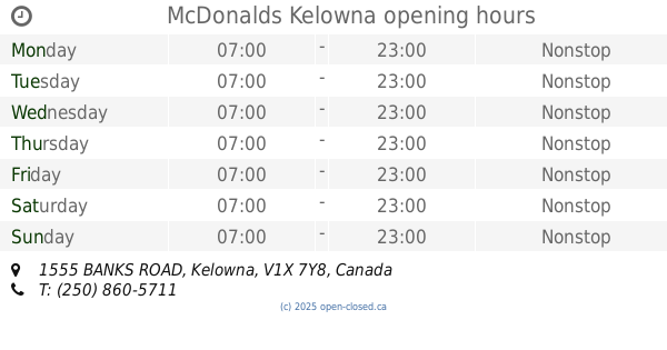 It is also possible to : Edit these OPENING HOURS of Restaurant McDonalds In Kelowna, 1555 BANKS ROAD,